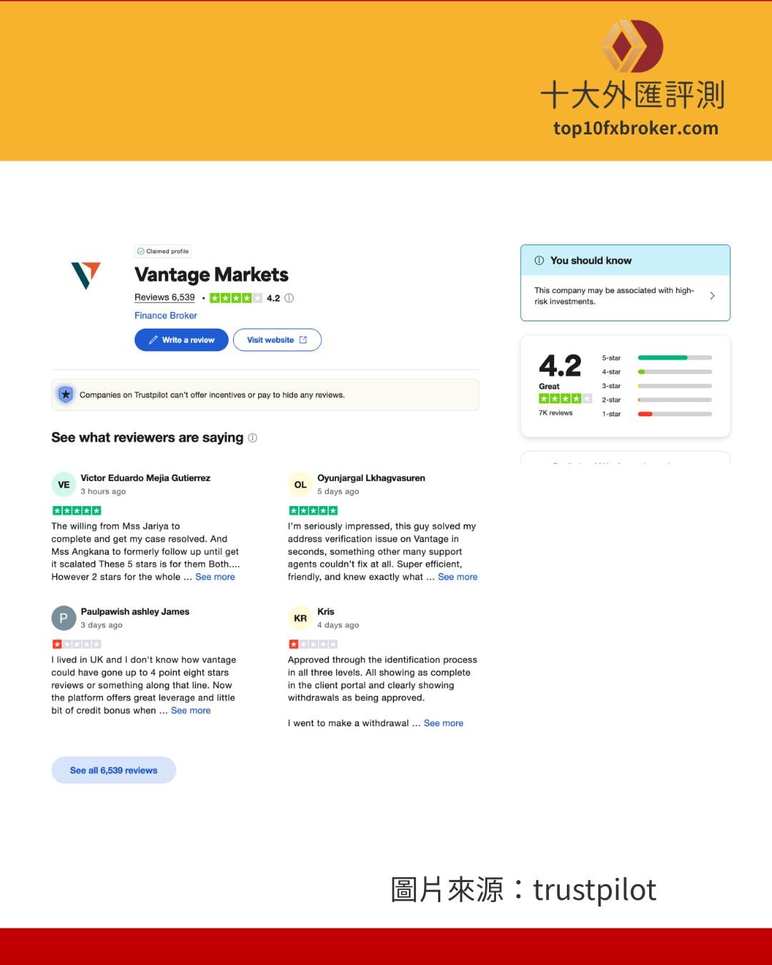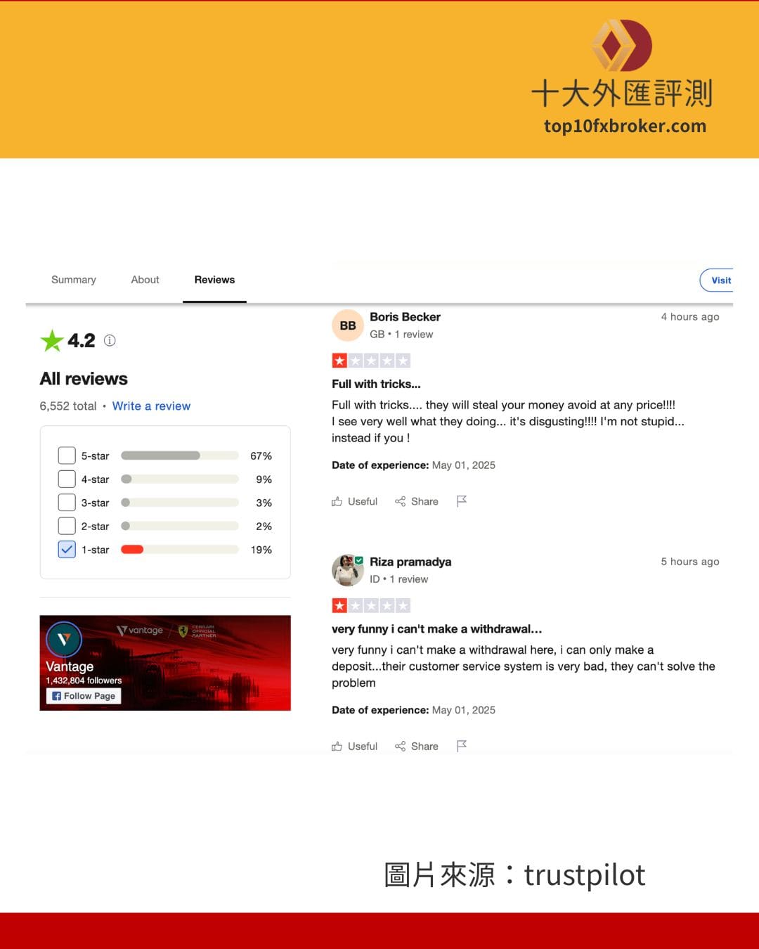 在 Trustpilot 上,Vantage 的整體評分大約是 4.2 星/5 星,看起來不錯,不過評論內容其實滿兩極化的。大約 67% 的用戶給出 5 星好評,但也有接近 19% 的人打了 1 星。換句話說,有人很滿意,有人則是踩雷。