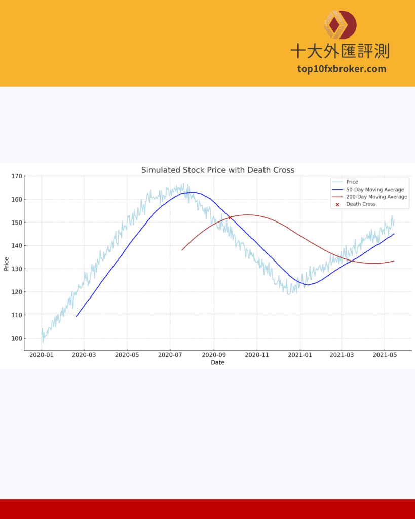 價格從移動平均線上方往下跌破時,股價穿過移動平均線,股價與移動平均線形成一個死亡交叉的態勢,這通常象徵著市場即將進入空頭趨勢。股價跌破移動平均線也是最常見的賣出訊號之一。