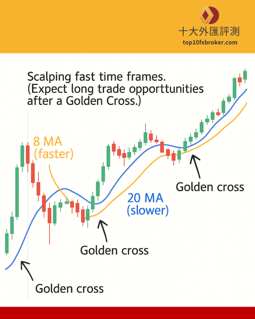 當價格由下往上突破移動平均線時,股價跑到移動平均線之上,與移動平均線呈現交叉之態勢,即為黃金交叉。這時的黃金交叉意味著市場有可能由空頭轉為多頭,此時投資人可以考慮進場,或是原本已經進場則可考慮加碼。突破反應了市場情緒,象徵著上升趨勢,也是最常見的買入訊號之一。