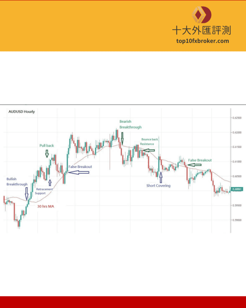 價格短暫跌破移動平均線後迅速回升,再次回到移動平均線之上,顯示此次跌破只是因為市場的短期震盪或是盤整,股價走勢並沒有真正發生反轉,所以叫假跌破。交易者能抓住此次的買進訊號,藉機加碼或是進場。