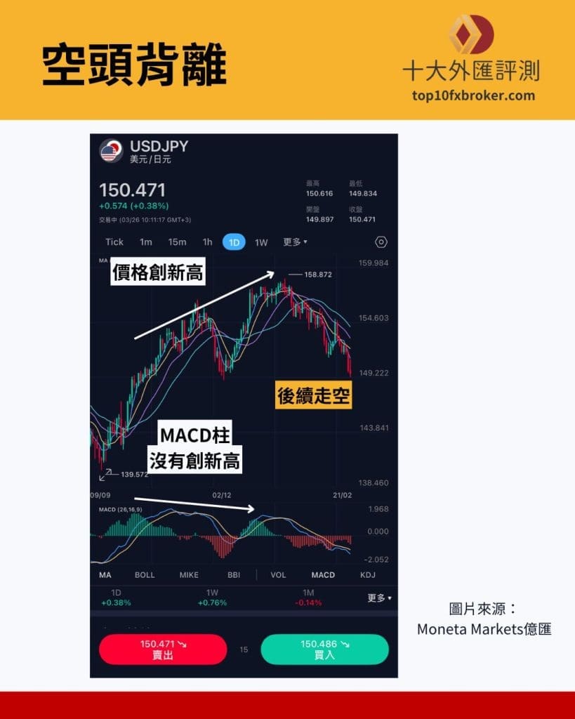 第二種是空頭背離,當市場價格屢創新高,但MACD指標卻顯示市場動能減弱,柱狀圖由正轉負,這就代表市場的多頭可能結束,空頭有可能開始,這時候該準備賣出。